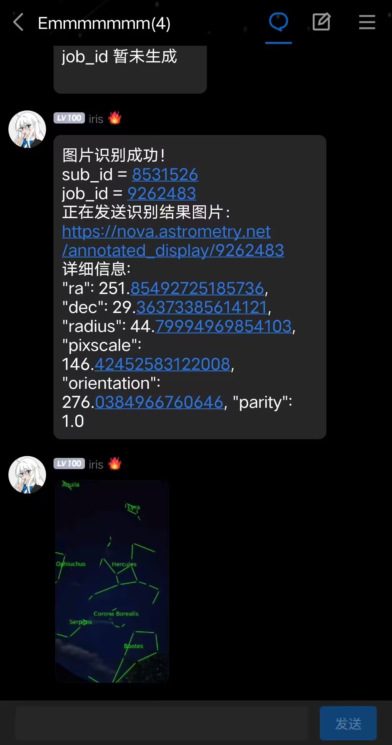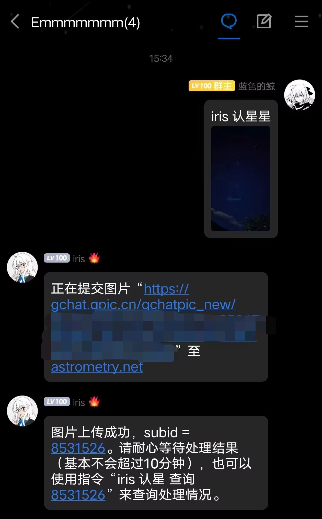 如果提交成功,会返回一个subid。你可以用 iris 认星星/认星 查询 <subid> 来查询工作状态(工作完成后iris会自动将结果发到群里);
